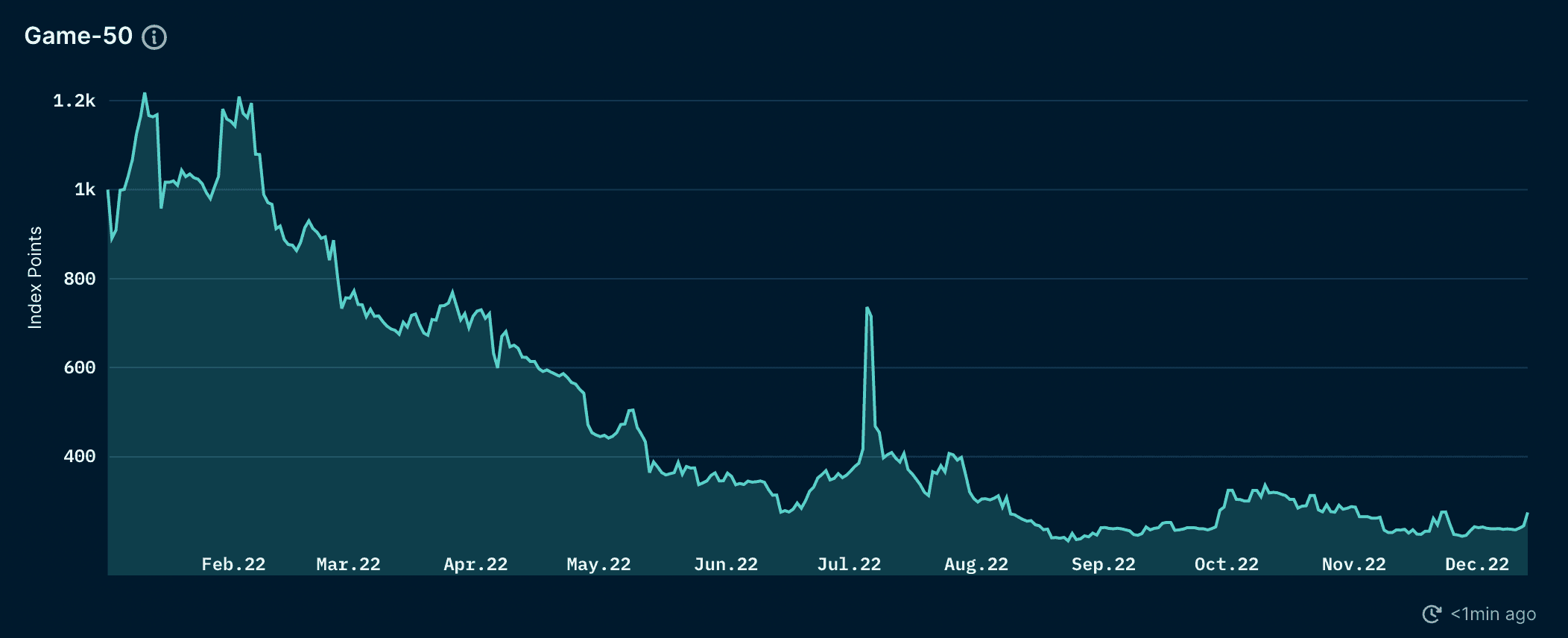 - Our Nansen Gaming-50 Index has fallen by 73% (ETH) YTD and 90% (USD). Despite the collapse of the gaming industry as seen in the gaming index, blockchain gaming is still dominating VC funding deals.
