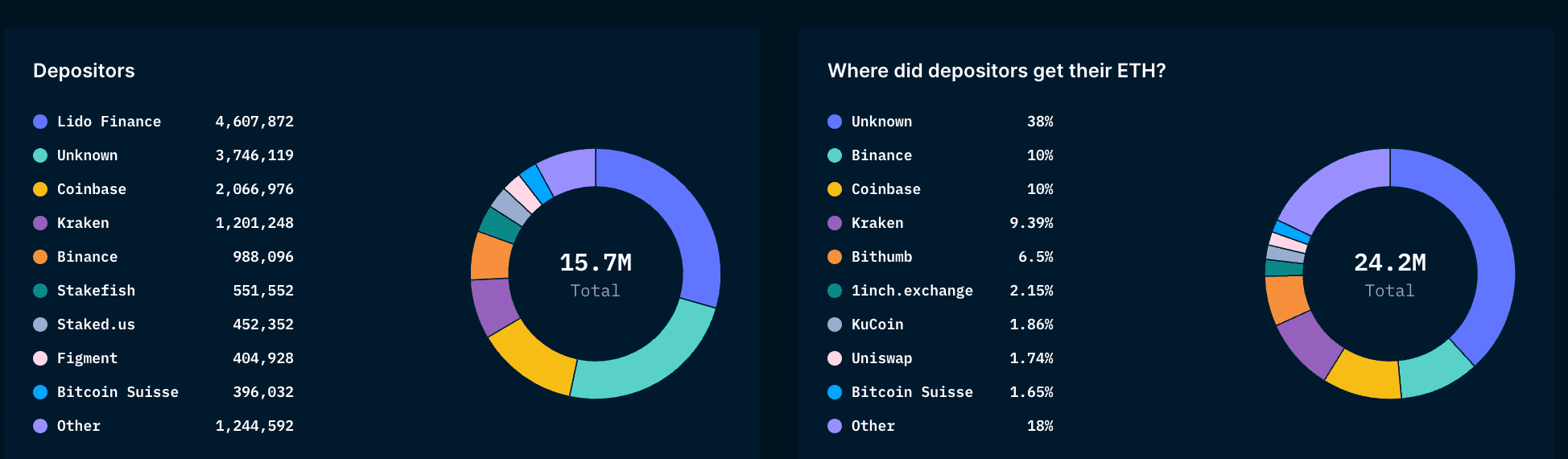- Lido held the greatest amount of staked ETH (29%), followed by Coinbase, Kraken, and Binance with a combined ~27%. Liquid staking services like Lido were set up to avoid the potential for centralized entities like exchanges gaining a majority of staked ETH. It is extremely important that liquid staking providers like Lido become sufficiently decentralized to be censorship resistant.