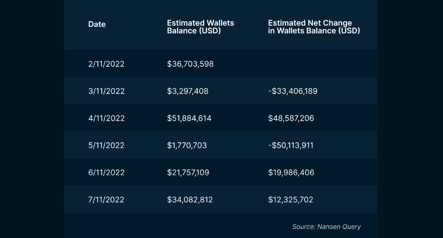 As for the FTX wallet balances, many withdrew funds from the exchange during these turbulent times, leading to high fluctuations in the total balance. Additionally, it is unclear what the actual balance of funds should have been, so determining a potential delta is also not an option.