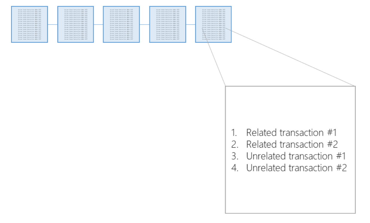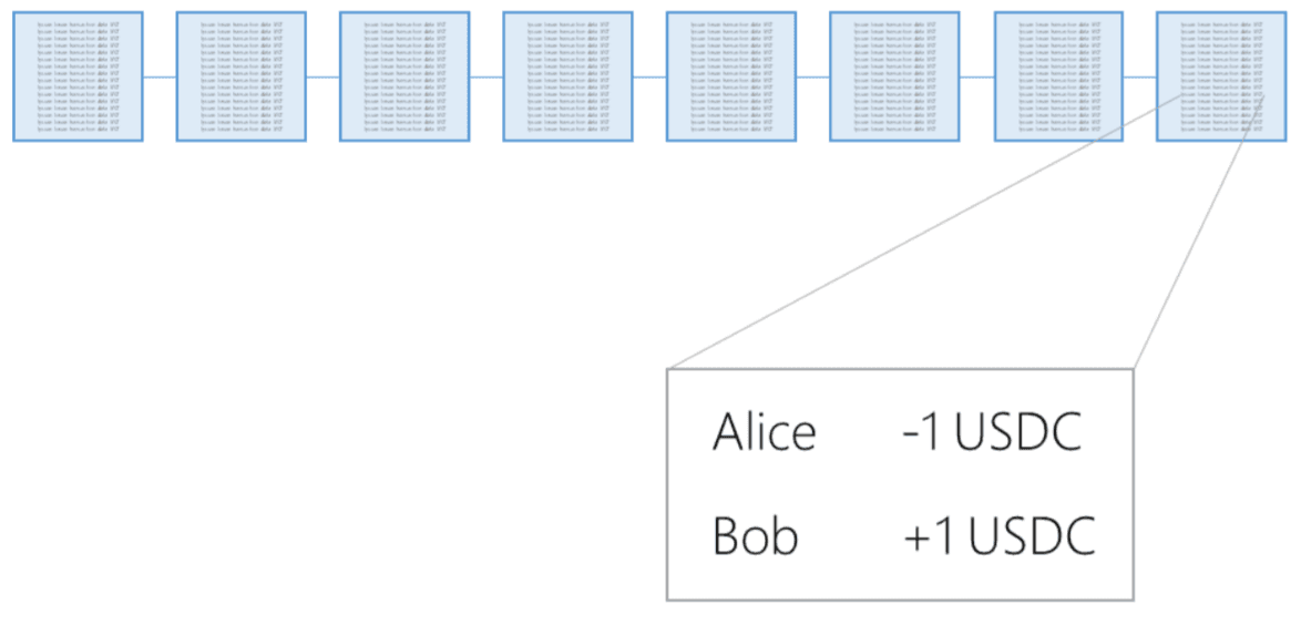 Zooming out, we can visualize how a large number of these transactions appear in a traditional blockchain ledger. Alice’s and Bob’s transaction is one of many transactions inside of one block within the universal ledger which contains all historical transactions for all assets, as shown below: