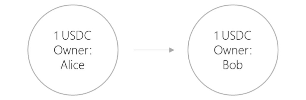 “Alice pays Bob 1 USDC” would look something like this on Sui. The ledger makes one update: a 1 USDC object with Alice listed as its owner would have its owner attribute changed to Bob.
