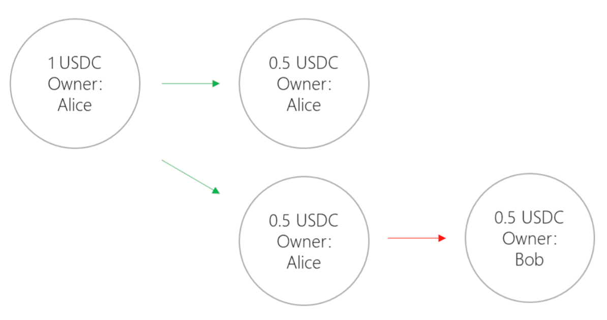 However, certain simple transfers may need to divide an existing object into two objects prior to processing the transfer. “Alice pays Bob 0.5 USDC” might require a transaction splitting a 1-USDC object into two 0.5-USDC objects with an owner attribute of “Alice” (green arrows), and a subsequent transaction to change the owner attribute of one of the 0.5-USDC objects from “Alice” to “Bob”.