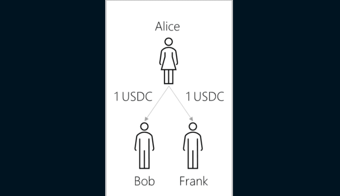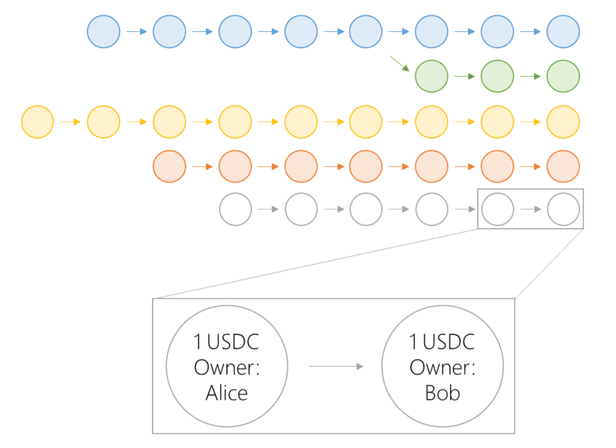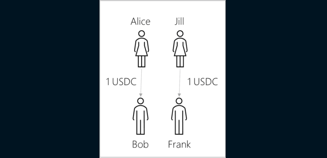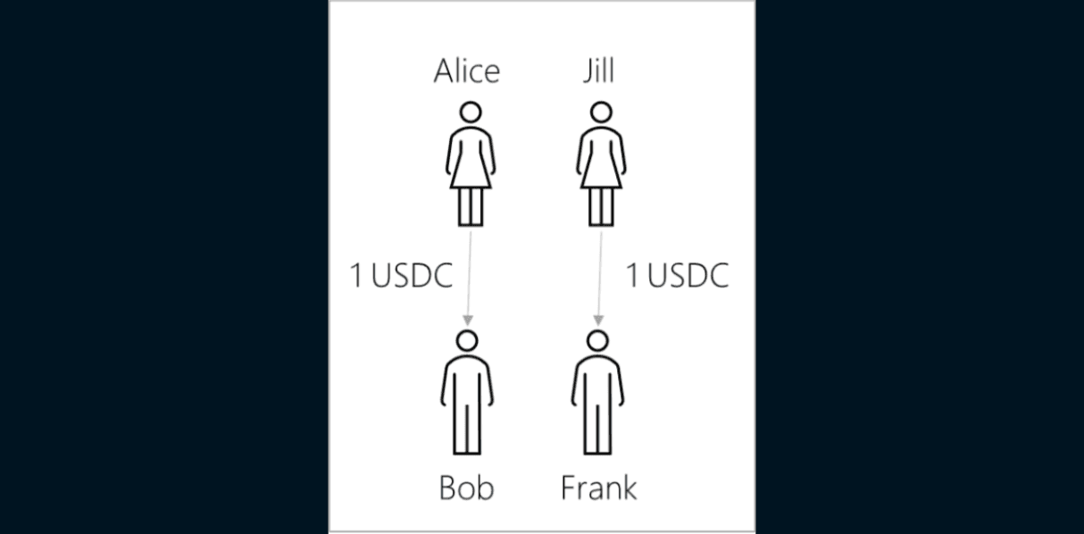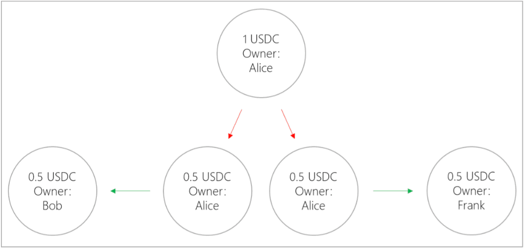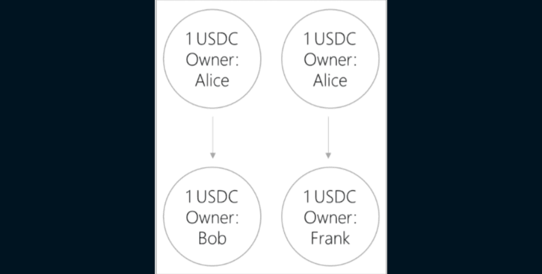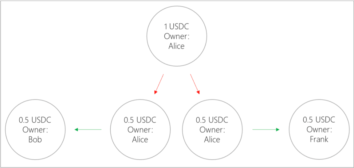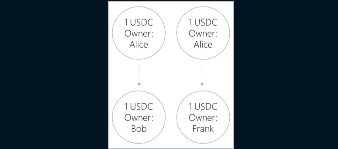 For example, if Alice owns 2 USDC, what she actually owns are two separate 1-USDC objects which each have an owner attribute of “Alice”. If she sends 1 USDC to two separate people (e.g. Bob and Frank), these transactions do not need to be sequenced. In an address-centric model, these transactions must be sequenced in order to confirm that Alice has a sufficient USDC balance to pay for both of her requested transactions.