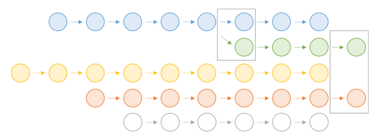 The green and orange transactions highlighted on the right side of the chart are not related to one another, so they do not need to be sequenced at all. They can simply be written to the ledger without achieving consensus on the order in which they occurred. Conversely, the blue and green transactions highlighted at the top center of the chart interacted with the same object (the fifth version of the blue object) so they would need to be sequenced. If the blue object happens to be a “shared object”, the transactions would need to undergo sequencing via Narwhal and consensus via Tusk.