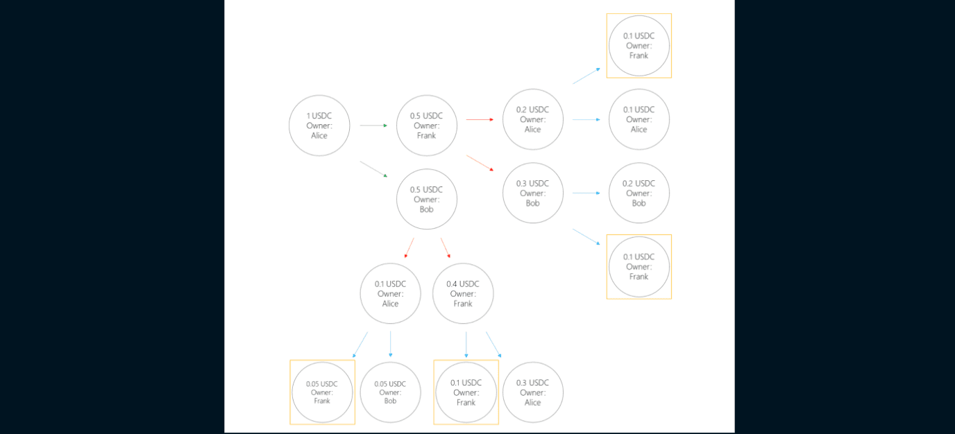 Using the characters from our prior examples, let’s say Bob, Frank, and Alice continue exchanging fractions of USDC with one another over a period of time. After just three rounds of these transactions (represented in the diagram below by the different colored arrows), the original single object of 1 USDC may end up split into as many as eight separate objects. Obviously, this can quickly complicate Sui’s object pool and its associated transactions.