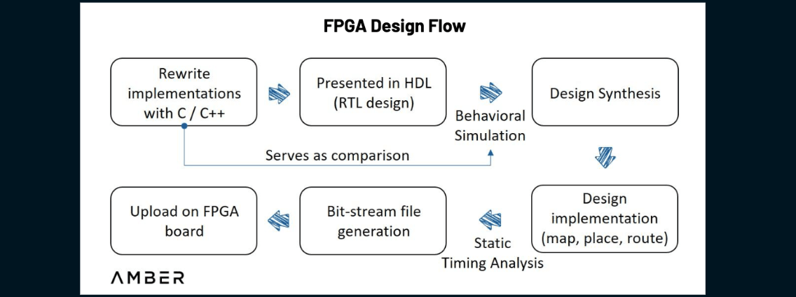 To achieve ZKP acceleration on an FPGA, a few steps are still required. First, a reference implementation for a particular proving system written in C / C++ is needed. Then, this implementation would need to be presented in HDL (Hardware Description Language) to describe the digital logic circuits at a high level.