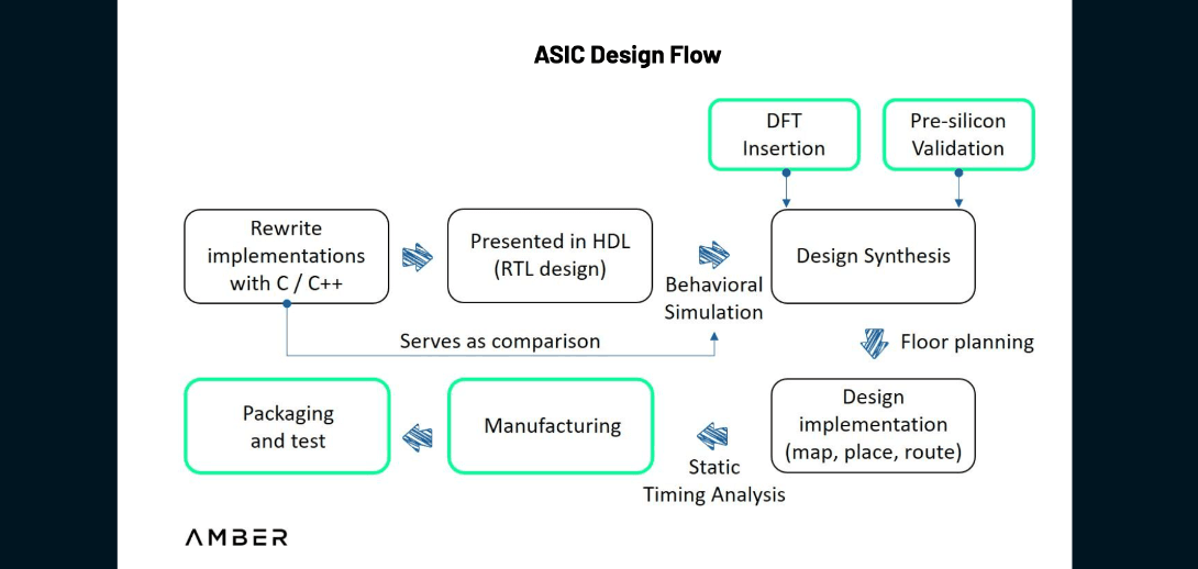 In terms of the design flow, compared with FPGA, ASIC involves detailed pre-silicon verification (as well as DFT) between HDL writing and synthesis, and floor plan before implementation. The former is for engineers to test the design in a virtual environment with sophisticated simulation and emulation tools, and the latter is to determine the size, shape, and locations of modules in a chip. After implementation of the design, all the files are sent to foundries such as TSMC or Samsung for test tape-out. If that succeeds, the prototype is then sent for assembly and test.