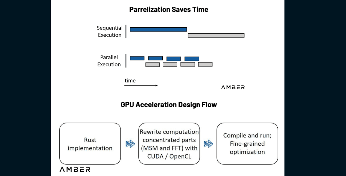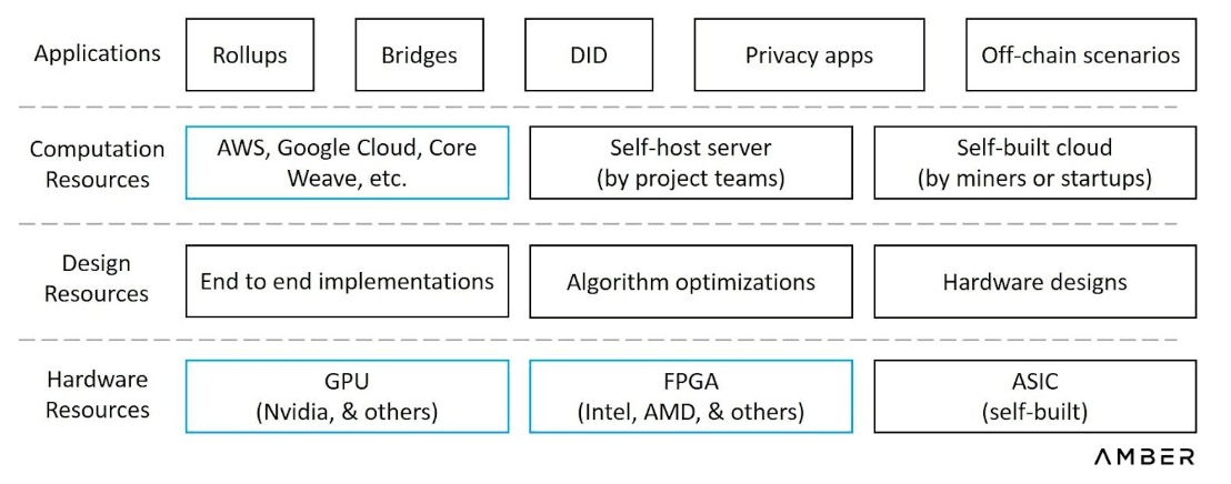 GPU was initially designed for manipulating computer graphics and image processing, but its parallel structure makes it also a good choice for areas like computer vision, natural language processing, supercomputing, as well as PoW mining. Both MSM and FFT can be accelerated on GPU, especially for MSM via leveraging an algorithm called ‘pippenger’, and the development process is much simpler compared with FPGA or ASIC.