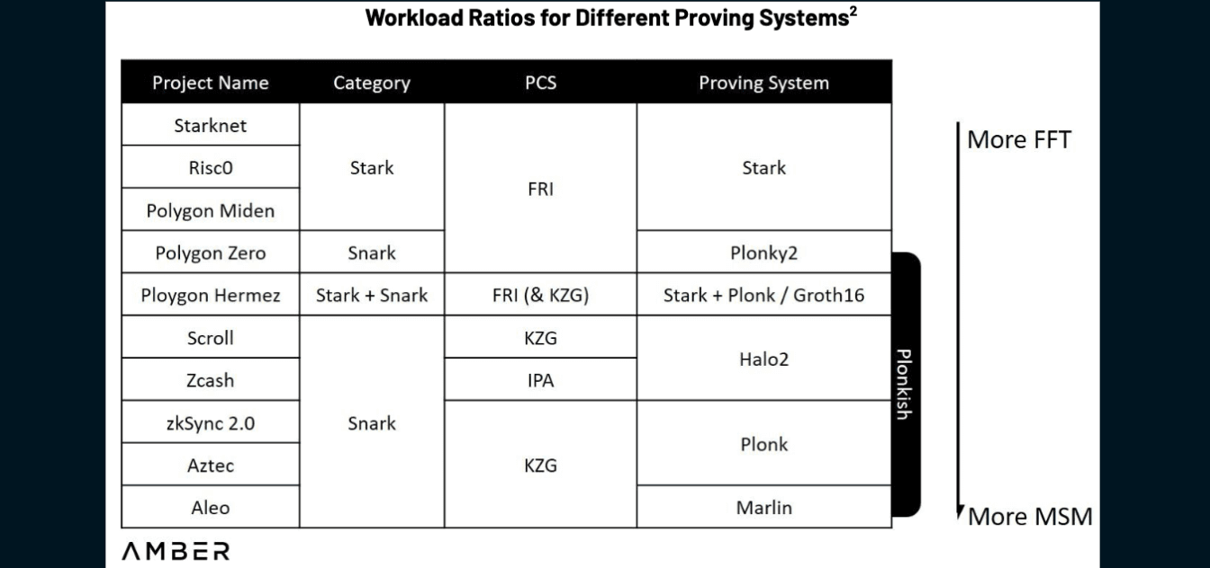 Georgios Konstantopoulos from Paradigm explains in his report on hardware acceleration that time used for proof generation is dominated by two types of computation tasks: MSM (multi-scalar multiplications) and FFT (Fast Fourier Transforms). However, instead of using a fixed number, establishing different PIOPs and choosing from different PCSs will bring different workload ratios of FFT / MSM. Using Stark as an extreme example, the PCS Stark uses, FRI (Fast Reed-Solomon Interactive Oracle Proofs of Proximity), is RS-code based instead of ecliptic curves used by KZG or IPA, so MSM is totally not involved in the whole proof generation. We show a rough order of the workload ratios for different proving systems as below, with the caveat that 1) It’s hard to estimate the exact ratio of the whole system; and 2) projects usually have their own modifications on the system when implementing.